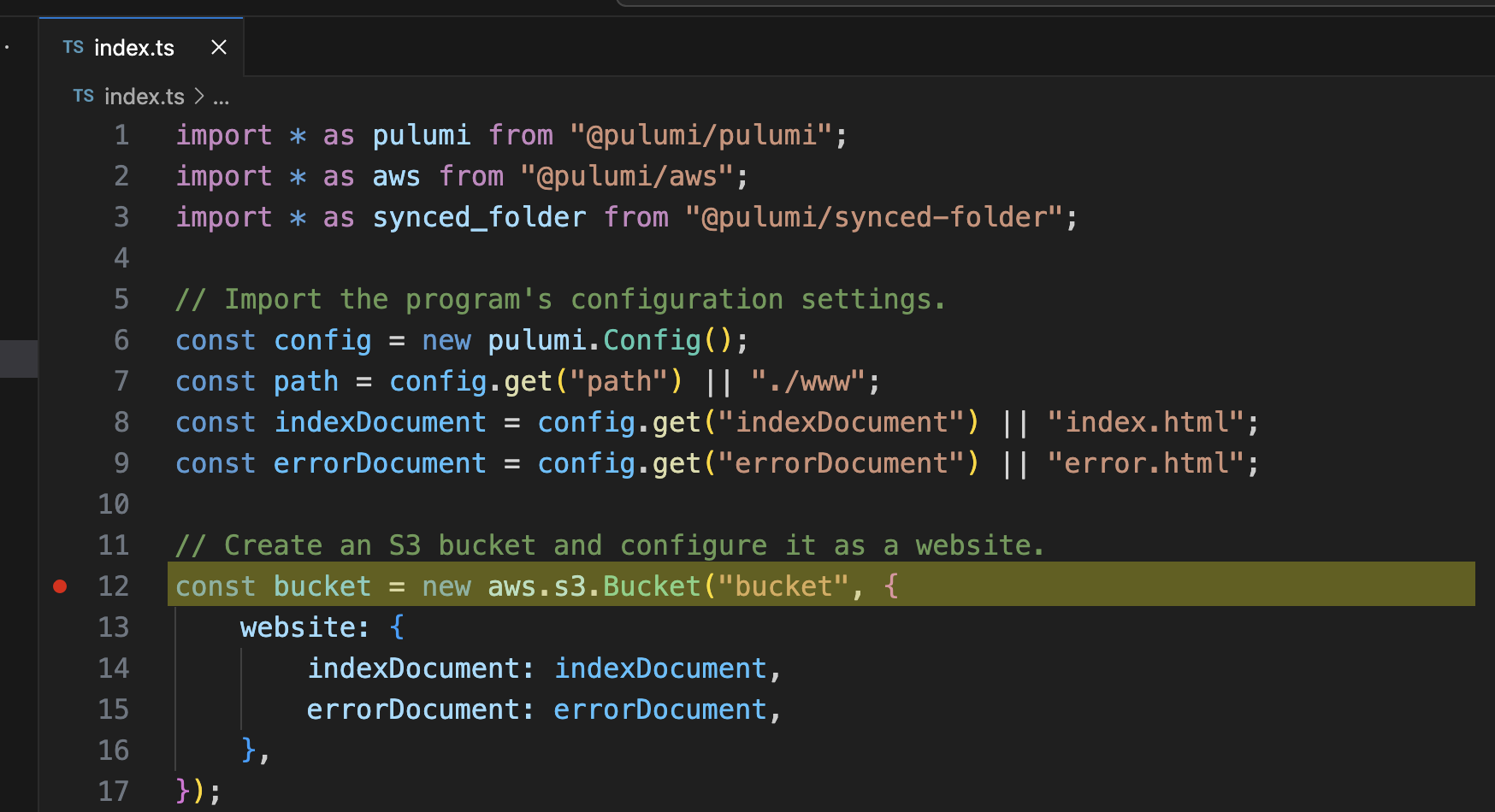 Navigate to line 12 within the code and hit the F9 key. You’ll see a small red dot appear next to the line indicating that a breakpoint has been set. This line defines the bucket our program creates and seems like a good place to stop if we want to check the input configuration before we run the AWS S3 provider call.