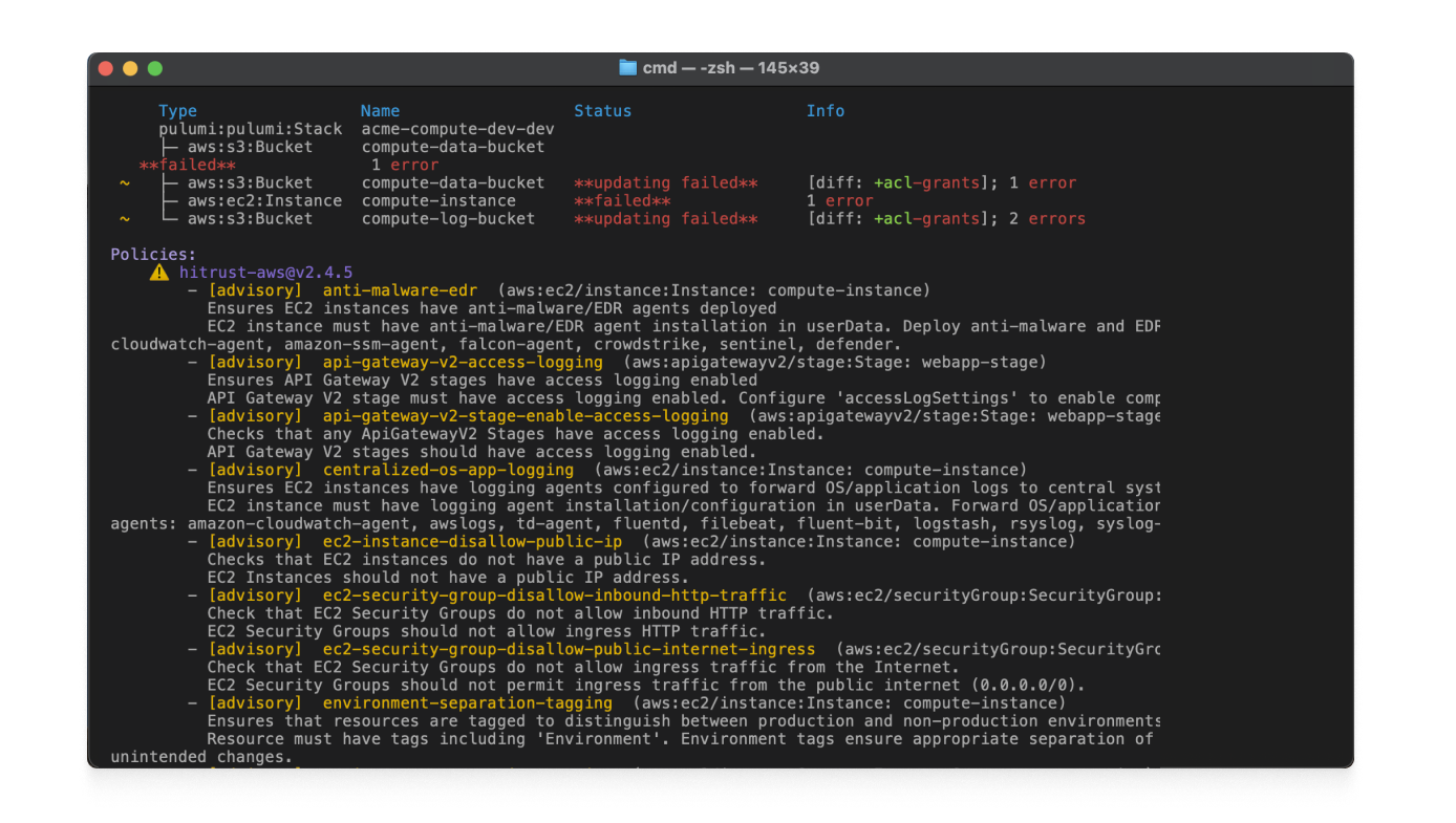 Policy guardrails block non-compliant deployments automatically
