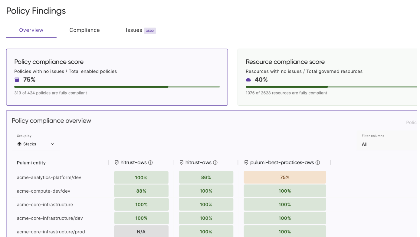 Pulumi Neo’s policy remediation capabilities and pre-built compliance frameworks. CIS Controls, NIST SP 800-53, PCI DSS v4.0, and HITRUST CSF v11.5 compliance packs are available starting with Team tier. Continuous compliance monitoring and AI-powered fix generation are available in Team, Enterprise, and Business Critical editions.