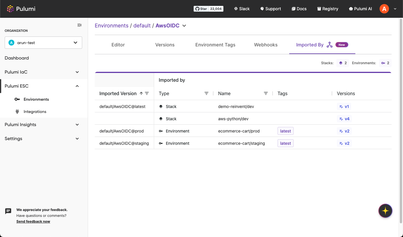- Pulumi IaC stack visibility: Environment import information is also available on the Stacks page and within individual stack overview pages.