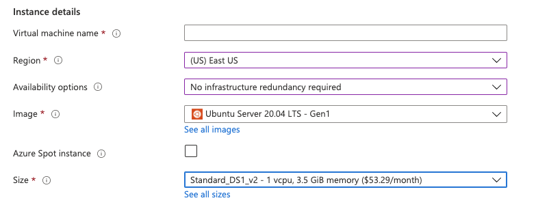 Next, we’ll provide details for the VM by giving it a name, myVM, setting the Region and Availability options to No infrastructure redundancy required. We’ll use an Ubuntu image and set the VM size Standard_DS1_v2.