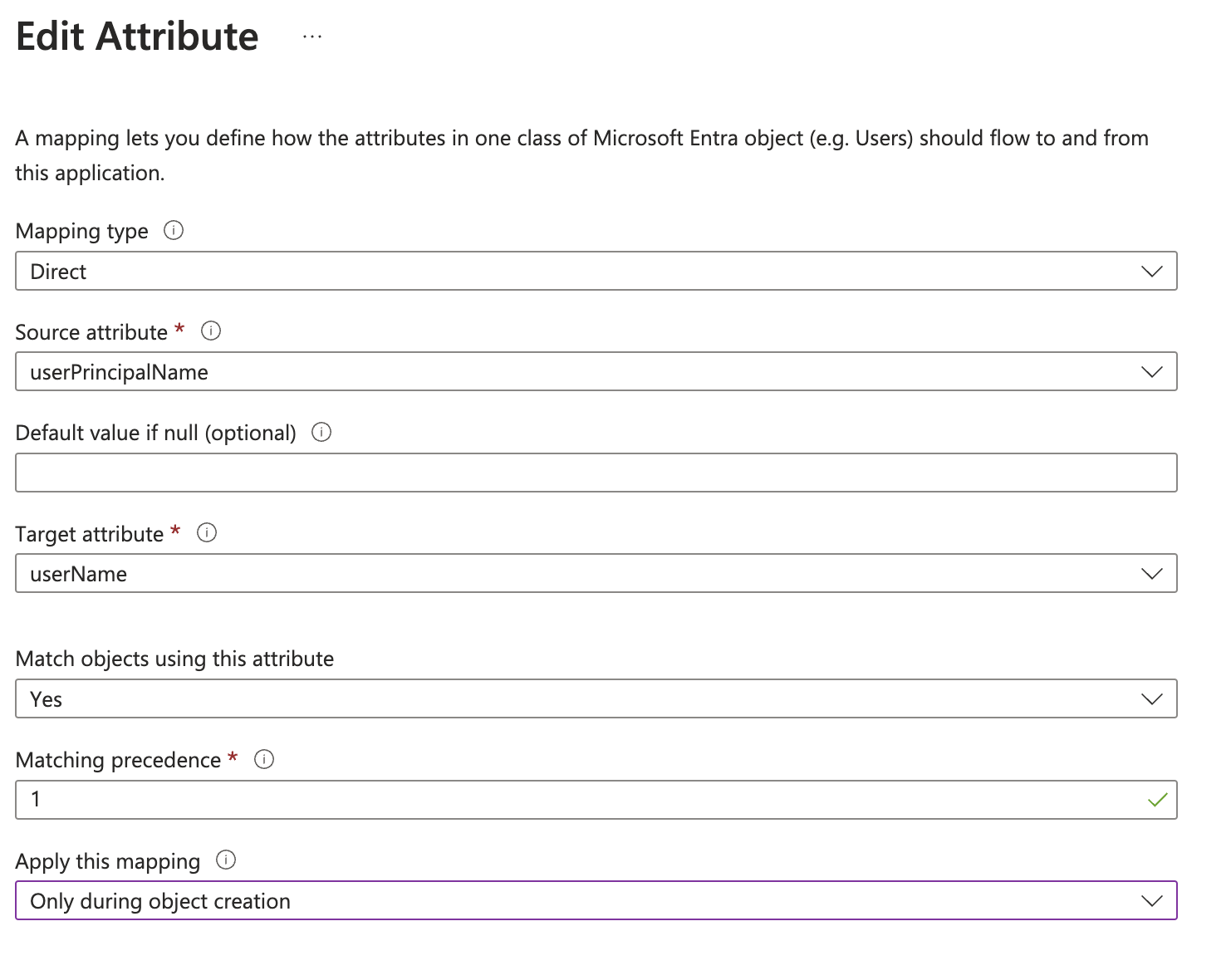 Update the mapping for userName so that is applied Only during object creation. In the Mappings expansion panel, click Provision Microsoft Entra ID Users and then click on the corresponding attribute mapping as shown below.